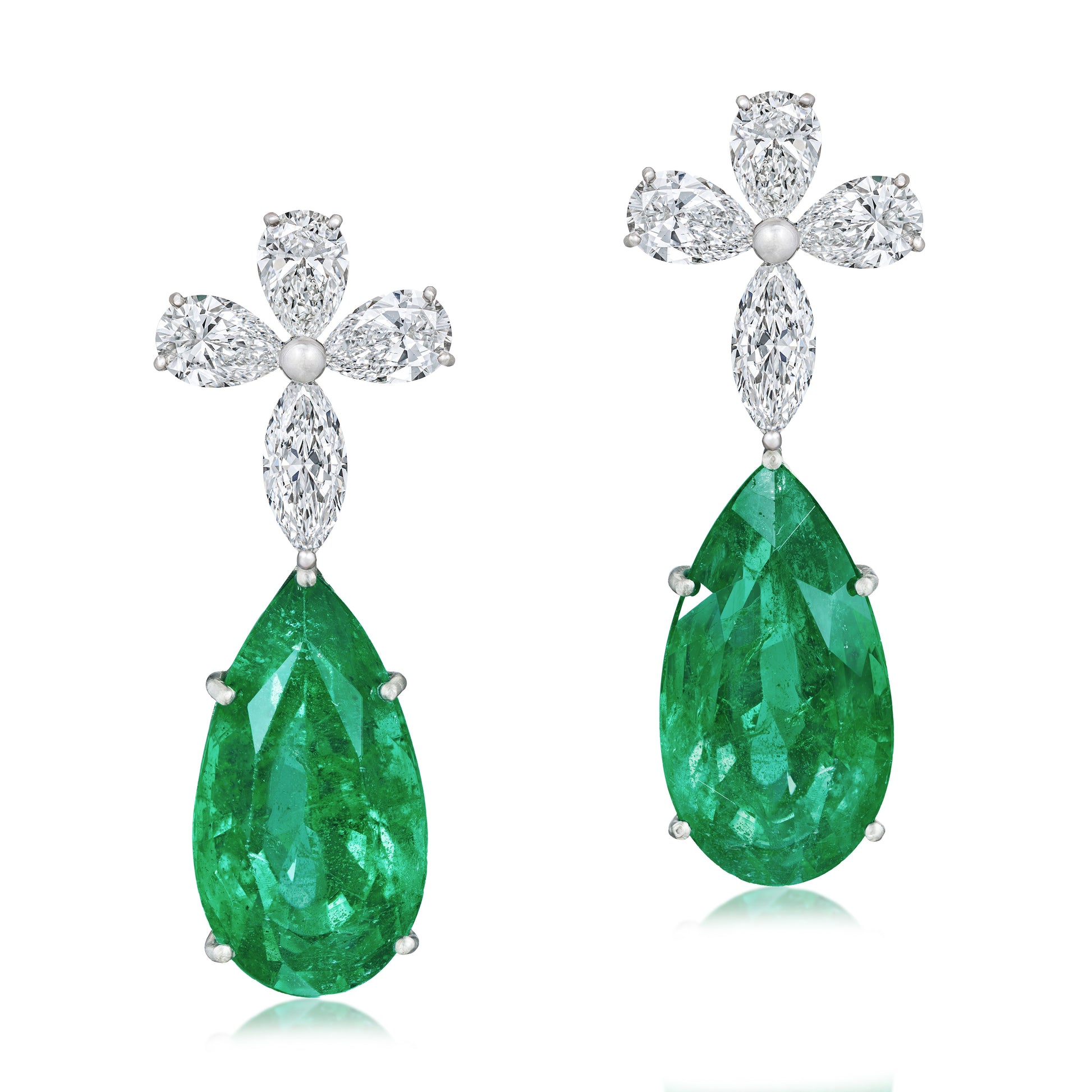 Stunning 12.27ct pear-shape emeralds and 1.59ct diamonds drop earrings, weighing a total 7.8 grams. All stones are set in platinum baskets; with the emeralds set in 4-prongs, pear shape diamonds set in 3 prongs, and marquis diamonds set in 2 prongs. Diamonds are natural D-E color and VVS1-VVS2.