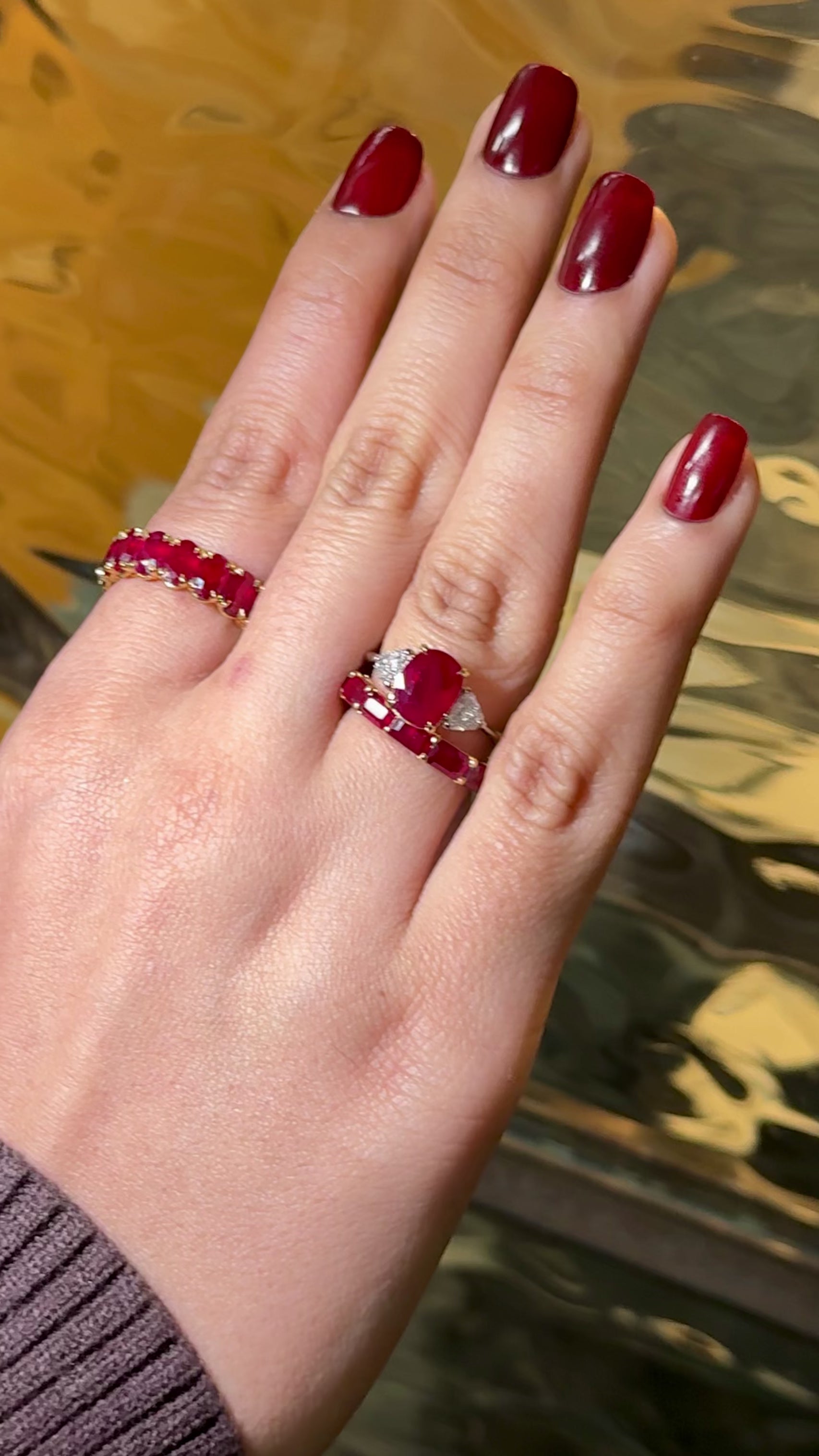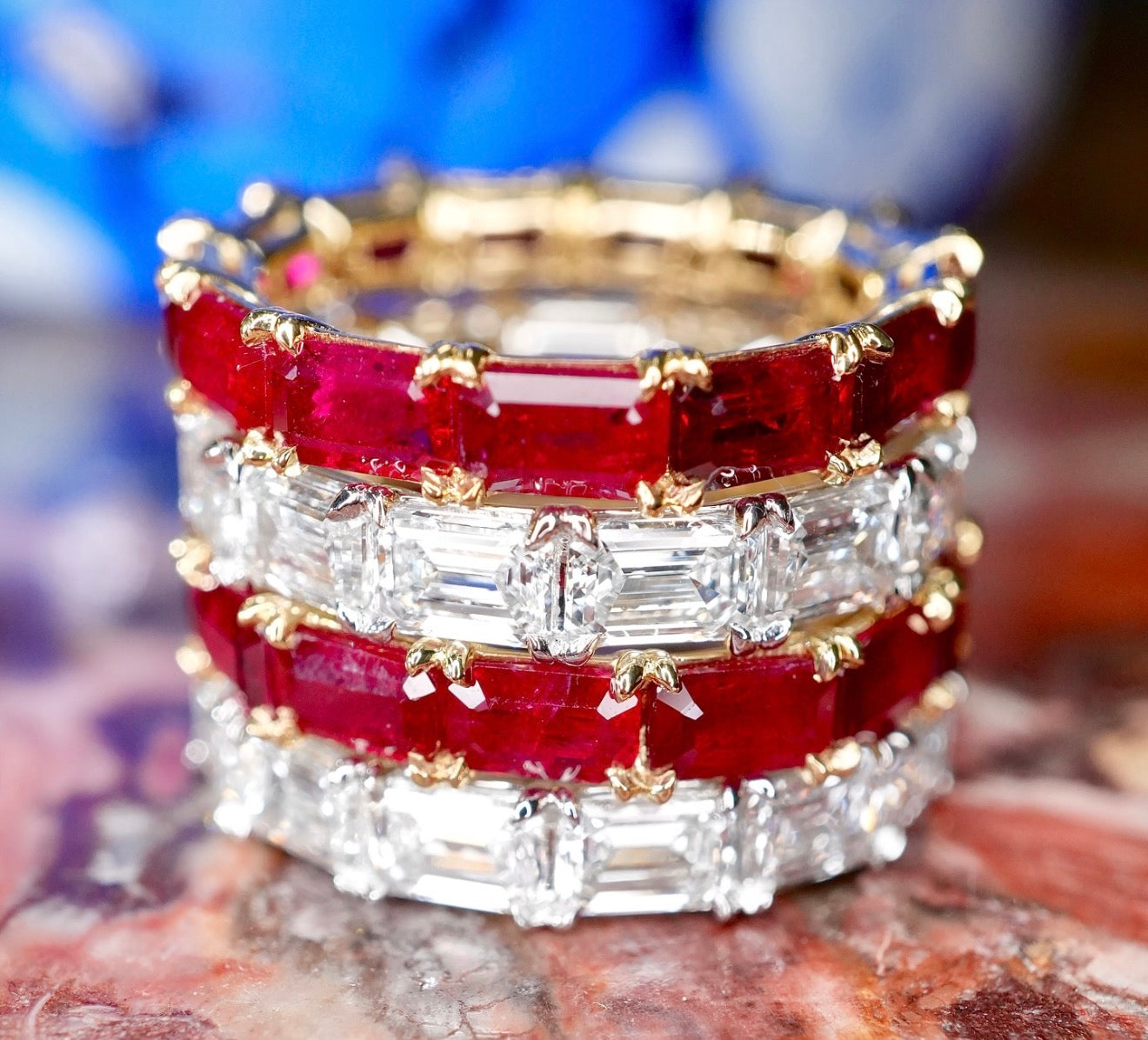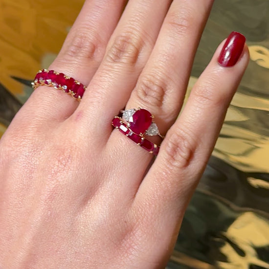 This eternity band features 13 perfectly matched emerald-cut Burma "pigeon-blood" rubies, renowned for their exceptional color and clarity. The rubies, with a total weight of 4.20 carats, are set in a sleek shared-prong design crafted in luxurious 18K yellow gold.