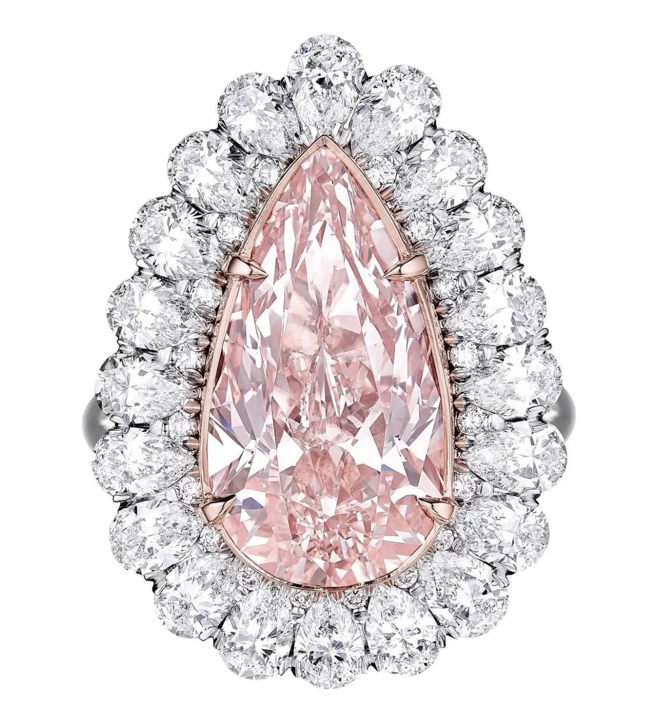 Details: Center stone: 5.59ct Pear shape Light Pink VVS1 natural diamond, 16.85 x 9.29 x 5.77 mm. 20 Pear shape White Diamonds D-E-F VVS1-VS2 side stones - 3.60 ct. 18 Brilliant Round D-E-F VVS1-VS2 diamonds side stones: .15ct. Total carat weight: 9.34ct. Metal: Platinum. Ring weight: 14.5 grams. Ring size: 6.